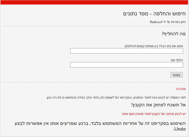 - יש לגשת אל הקובץ באמצעות הדפדפן, לדוגמא: mydomain.co.il/wp-change-domain.php , המסך שנקבל יראה כך.